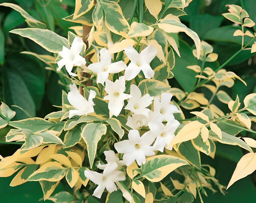 Jasminum officinale 'Variegatum', also known as Variegated Jasmine, is a hardy deciduous climbing plant celebrated for its stunning foliage and fragrant blooms. Each leaf features a rich green centre surrounded by creamy-white margins, providing a striking contrast that enhances any garden space. The variegated foliage catches light beautifully, adding texture and brightness to fences, walls, or garden borders even before the flowers appear. In summer and throughout early autumn, the plant produces clusters of delicate, star-shaped white flowers with an intense, sweet fragrance, especially potent during warm evenings. This combination of visual and olfactory appeal makes 'Variegatum' a true sensory delight.