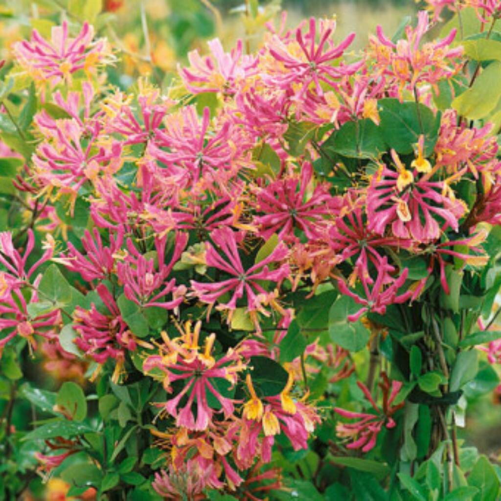 Lonicera heckrotii ‘Gold Flame’ is a cultivated variety of honeysuckle (Lonicera) celebrated for its ornamental beauty, long flowering season, and intense fragrance. Supplied in a 3-litre container approximately 18–20 cm in height and diameter, it establishes quickly in garden soil, raised beds, or large containers. Its buds emerge deep pink-purple and open to brilliant golden-yellow centres, producing a striking bi-colour effect. Clusters of trumpet-shaped flowers appear from midsummer through to late autumn, offering a prolonged period of colour and scent. The foliage is blue-green, providing a cool, attractive backdrop that enhances the fiery blooms.