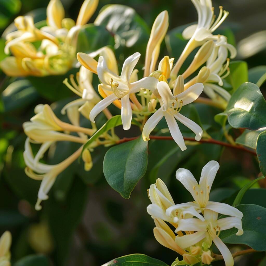 From midsummer, the plant produces clusters of tubular flowers that open creamy-white and mature to a soft buttery-yellow, adding multi-toned visual interest and releasing the classic, intoxicatingly sweet Japanese honeysuckle fragrance. The blooms attract pollinators, including bees and butterflies, while autumn berries provide food for birds. Twining stems allow it to climb pergolas, fences, arches, trellises, or walls, creating vertical coverage, floral canopies, or dense summer screens. Its scrambling habit also enables it to trail across the soil, providing vibrant ground cover that can suppress weeds and brighten borders.