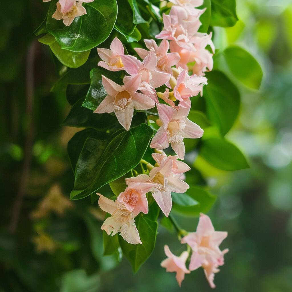 The most distinctive feature of ‘Pink Showers’ is its clusters of star-shaped flowers. Unlike typical white Star Jasmine varieties, the blooms are a soft, creamy-pink with a deeper pink centre, creating a “butterfly” effect that is visually striking. Flowering begins in midsummer and continues through to early autumn, providing a long-lasting display of colour, while the sweet jasmine-like perfume enhances outdoor seating areas, patios, and garden walkways. The blooms attract pollinators such as bees and butterflies, adding ecological value to your garden.