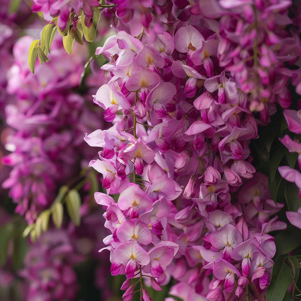 This variety is renowned for its exceptional pendulous racemes, which measure up to 45cm in length. Each raceme contains pea-like flowers that open from creamy white buds to reveal soft mauve-pink tips, producing a striking bi-colour effect reminiscent of delicate butterflies or artistic brush strokes. The sequential blooming along each raceme extends the flowering period, providing a long-lasting and high-impact display. The flowers emit a sweet, musky fragrance, filling pergolas, arbours, and garden pathways with a delicate, enchanting scent that enhances outdoor living areas and sensory garden experiences.