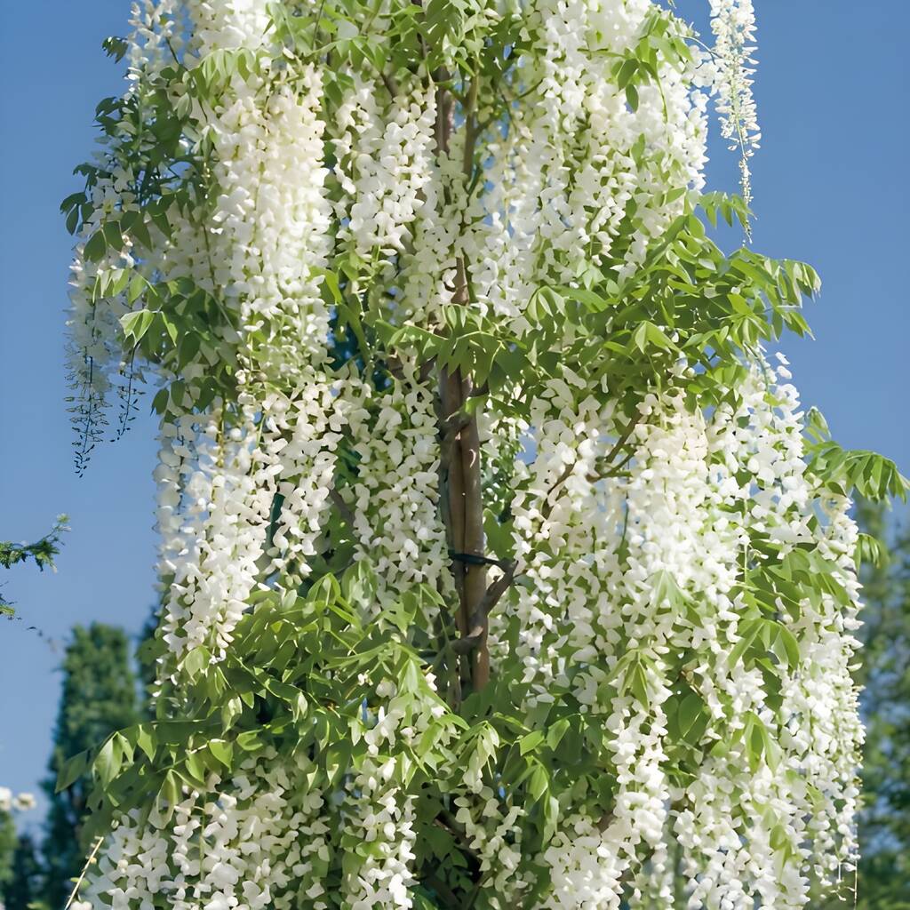 The plant is renowned for its vigorous growth habit and robust, woody stems. It quickly scales walls, fences, pergolas, or garden arches, creating a dense, structural framework that supports future growth and flowering. This rapid, high-impact vertical growth allows gardeners to achieve a full, cascading display with minimal waiting time. Its foliage is lush, bright green, and provides a complementary backdrop to the striking snowy-white racemes. Even after flowering, the twisted stems of the Wisteria provide architectural interest throughout the year.