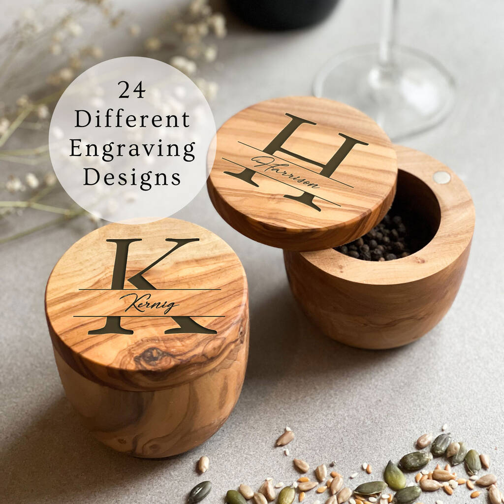 A beautifully crafted sugar / salt / spice pot with magnetic hinged lid. Engraved with a family monogram design and crafted from Italian olive wood