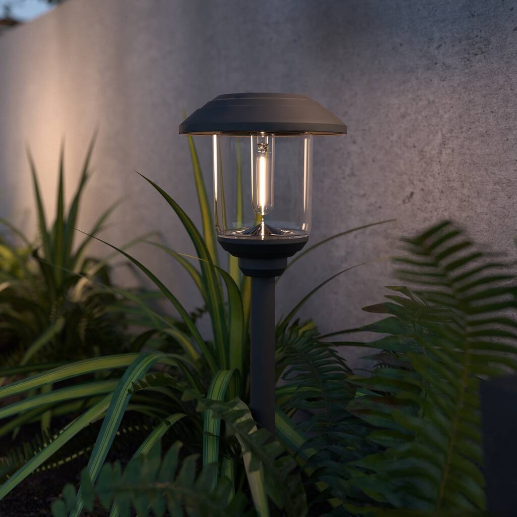 Illuminate a pathway or outdoor area with an elegant lantern-style post light. It features an integrated solar panel with automated on/off warm white lighting.The Grace Premium Solar Light takes elegance to a whole new level. Its contemporary black finish adds a modern twist to the classic design, while the delicate surround elegantly diffuses the light, casting a stunning glow across your outdoor space. Let's not forget about the show-stopper, the filament bulb, adding a timeless feature to the solar light. With easy installation and automatic operation, this solar light seamlessly integrates into your outdoor setting, and its durable construction ensures it withstands various weather conditions, making it ideal for year-round use.