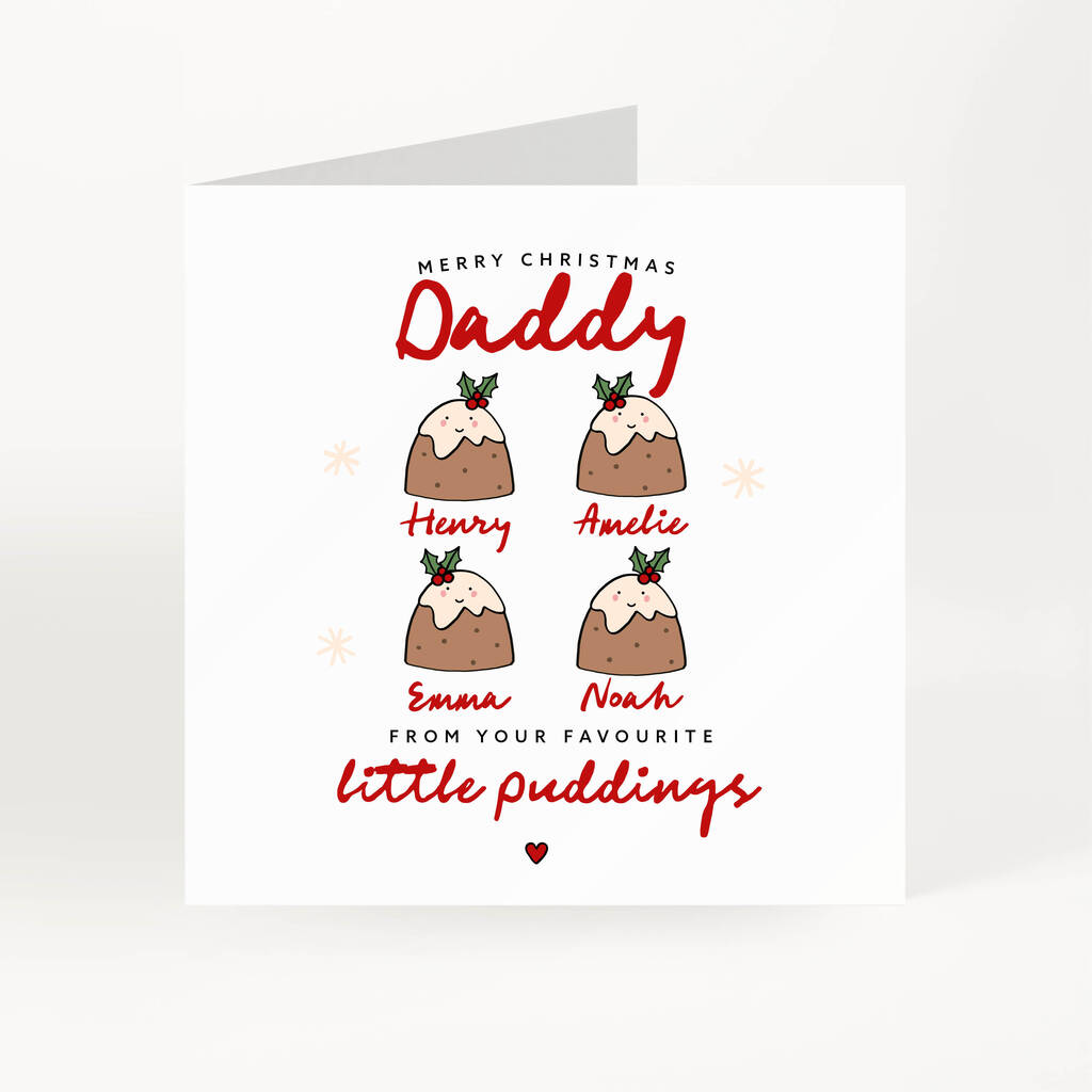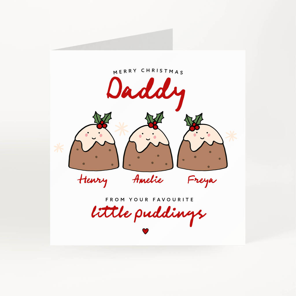Personalised Christmas card for Daddy with a cute little pudding design. A fun festive card from children, daughter or son to send this festive season