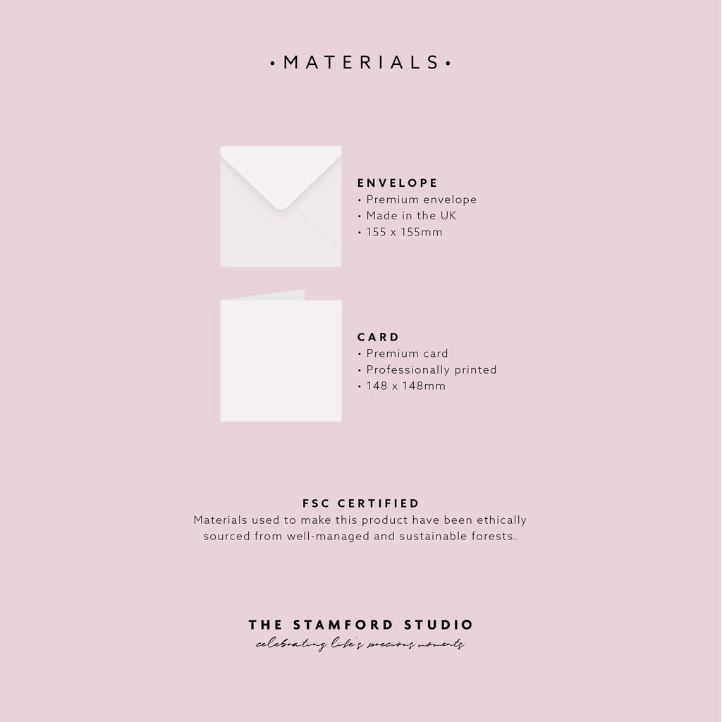 Each card is printed to order in our UK studio on premium FSC-certified board and paired with a crisp white envelope. Blank or printed inside for your own handwritten or typed message.
