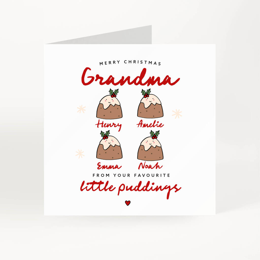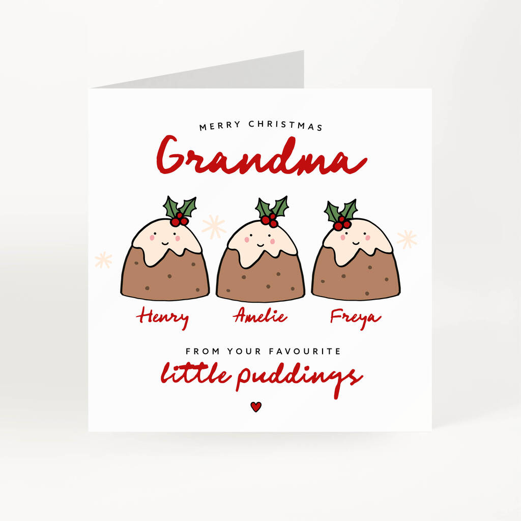 Personalised Christmas card for Grandma with a cute little pudding design. A fun festive card from grandchildren, granddaughter or grandson to send this festive season