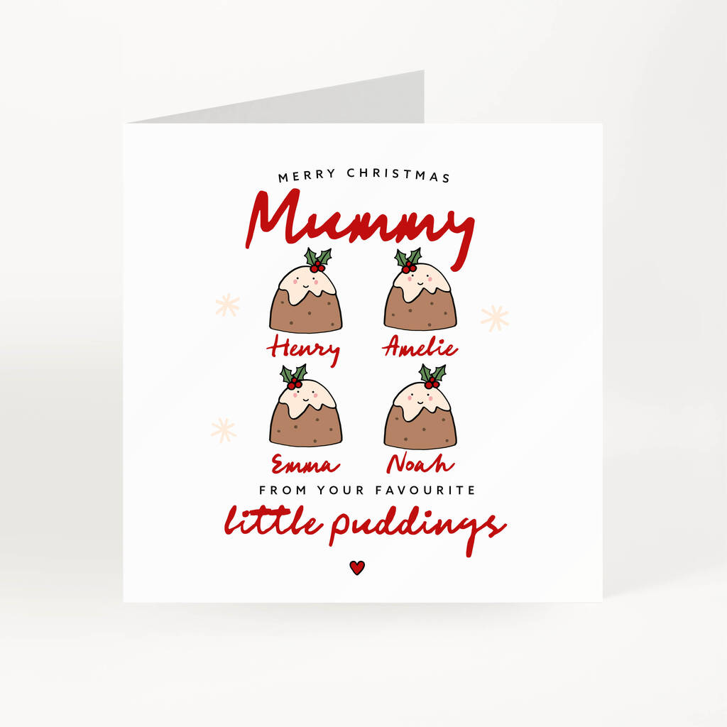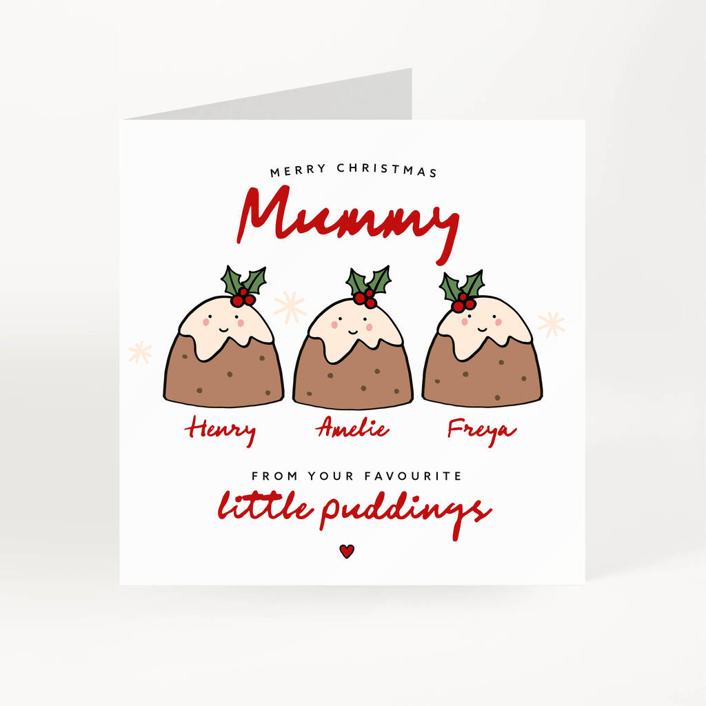 Personalised Christmas card for Mummy with a cute little pudding design. A fun festive card from children, daughter or son to send this festive season