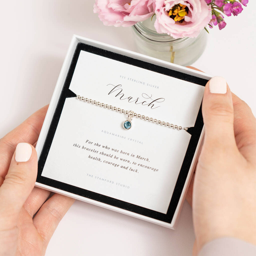 This handmade sterling silver March birthstone bracelet is the perfect gift to celebrate a friend or loved one's birthday.