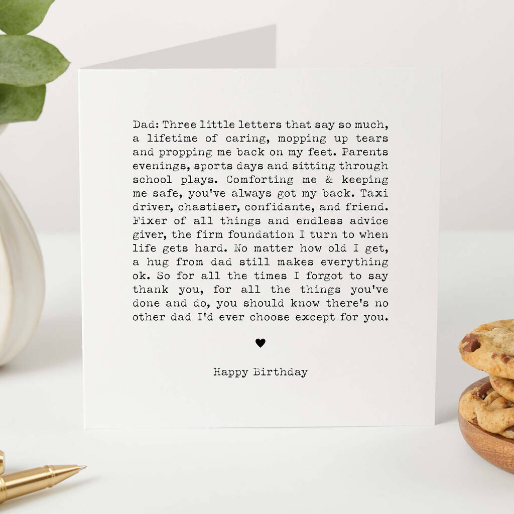 This heartfelt Dad birthday card is packed with sentiment, celebrating all the moments that make your dad one of a kind, from school plays and sports days to hugs that still make everything okay. Typed in an elegant typewriter-style font, the message honours Dad as a confidante, fixer, taxi driver, and cheerleader.