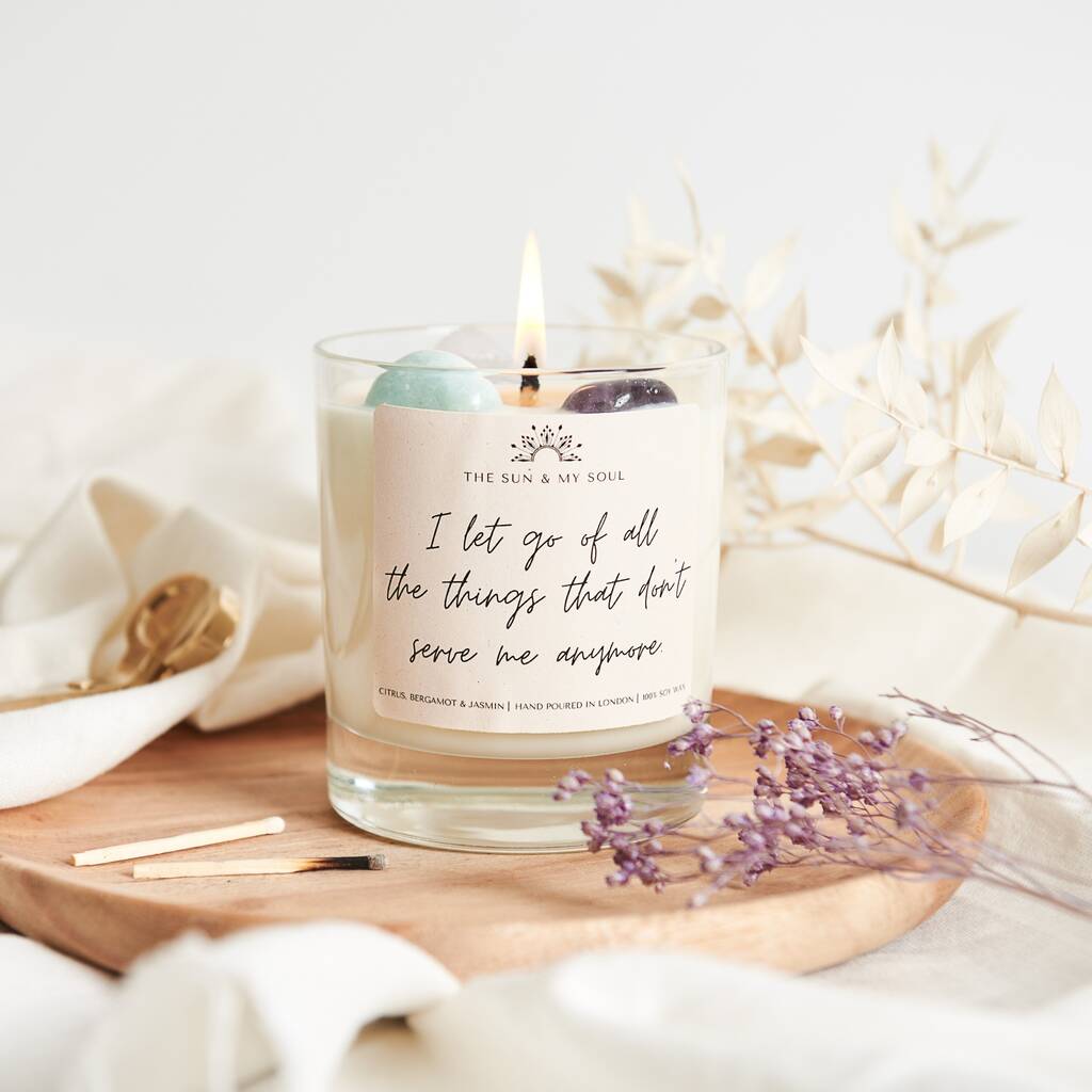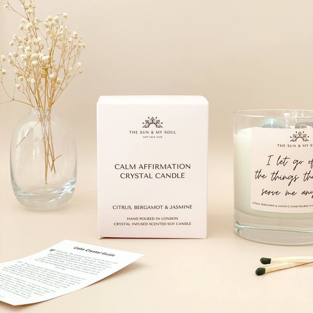 Calm Affirmation Crystal Candle in Gift Box, Size: 300 ml with 3 Crystals, Approx. burn time: 45 hours, Fresh Citrus, Bergamot and Jasmine Scent
