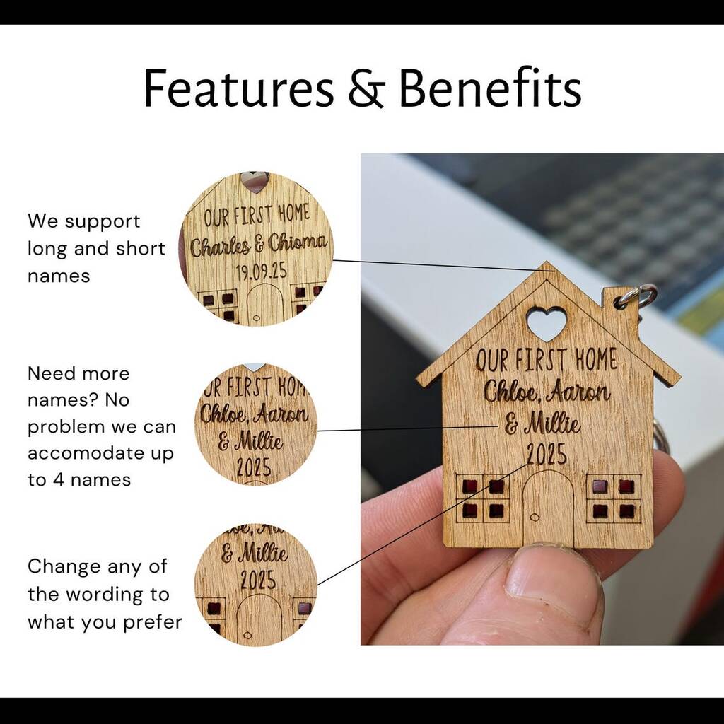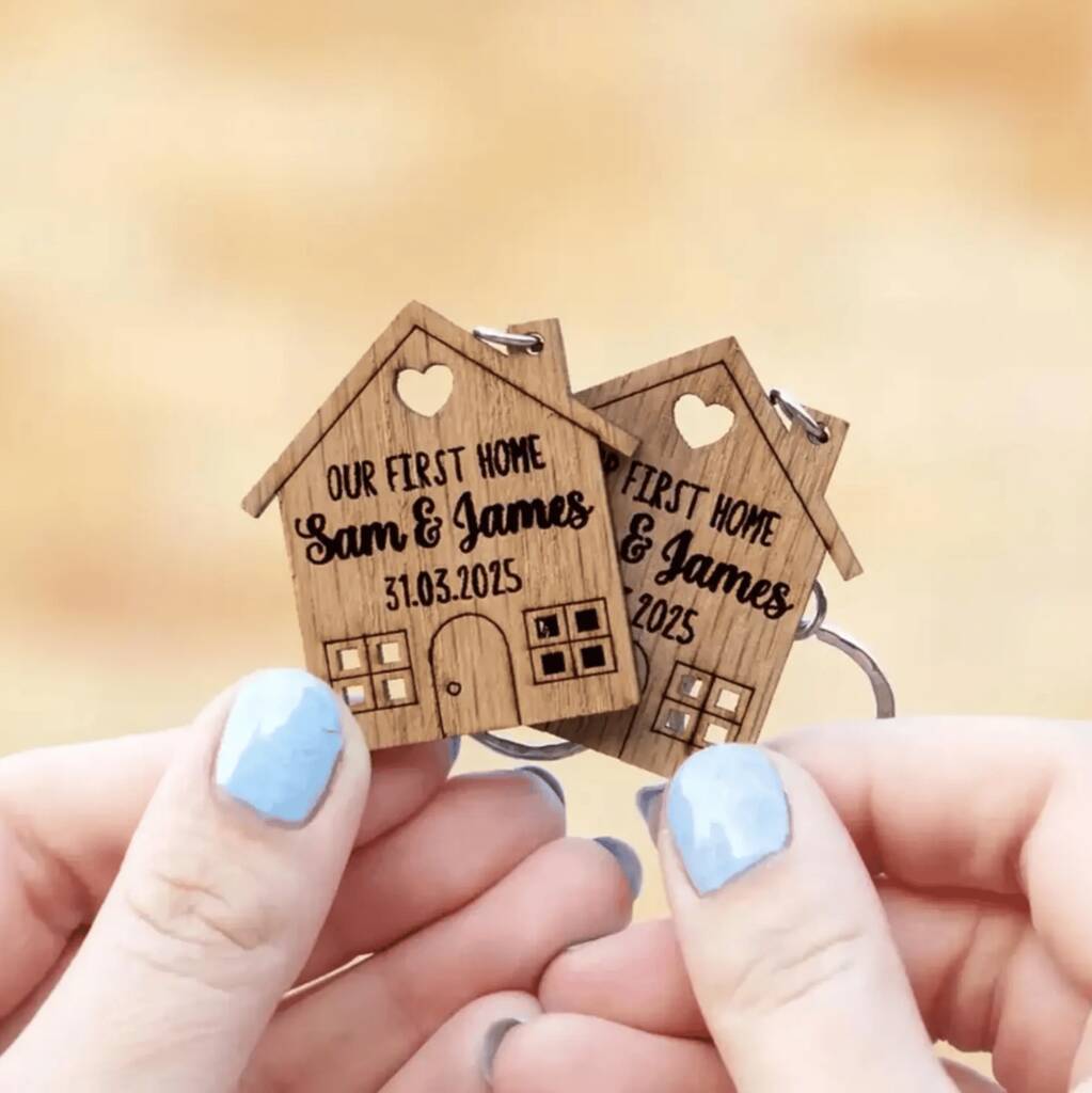Celebrate a new beginning with our personalised wooden ‘Our First Home’ keyrings beautifully engraved, eco-friendly keepsakes perfect for couples or families moving into their home.Our personalised ‘Our First Home’ wooden keyrings make a heartfelt keepsake for new homeowners. Expertly crafted from sustainably sourced wood, each keyring is engraved with your chosen names, date, and address to mark life’s special milestones. The matching design makes them perfect for couples or families moving into their first home together. A thoughtful, eco-conscious gift that’s beautifully made to last — ideal for housewarmings, anniversaries, or as a little token of “we did it!” joy. Each piece arrives ready to gift, adding a warm, personal touch to a new beginning.