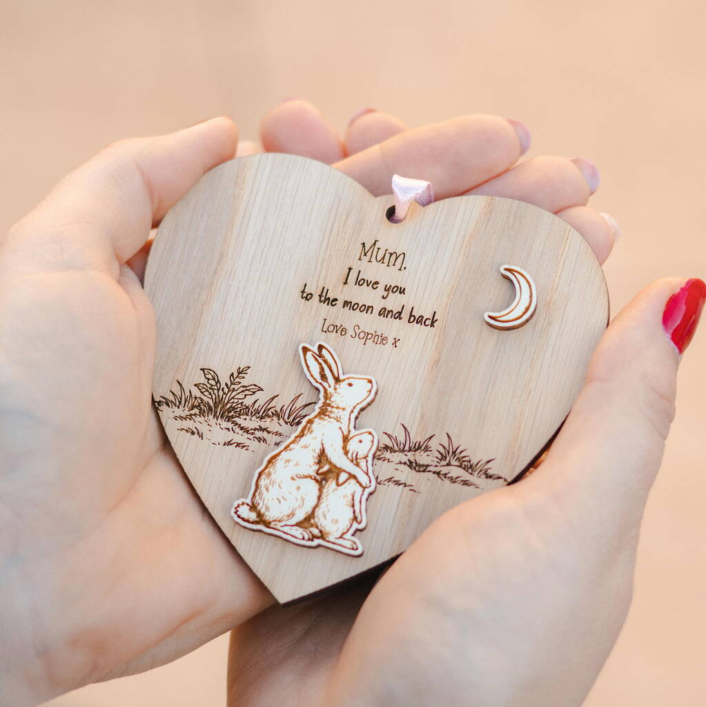 A heartfelt personalised wooden heart for Mum, beautifully engraved with “Love You To The Moon & Back” and finished with a soft pink ribbon.