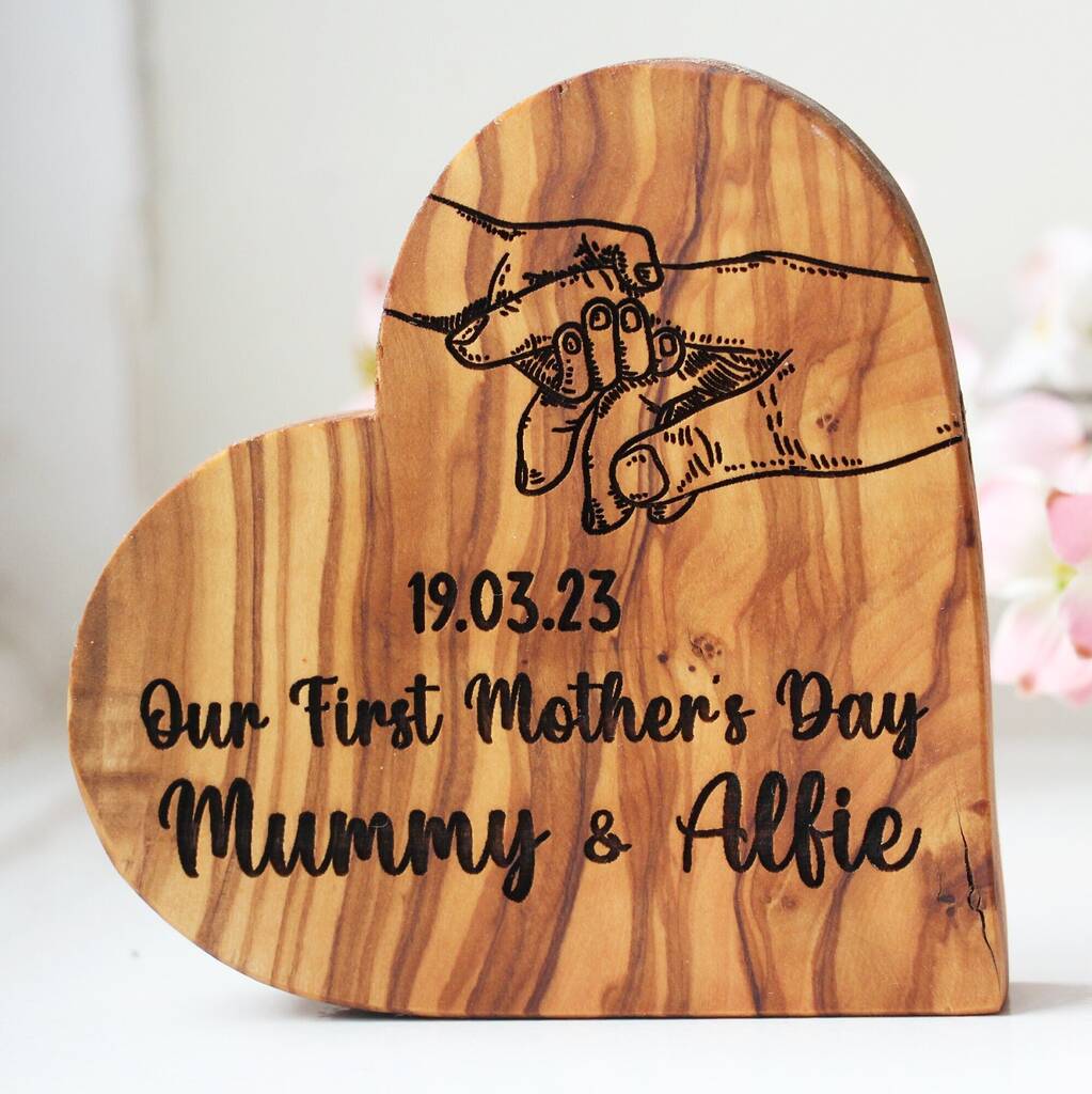 A personalised ‘Our First Mother’s Day’ wooden heart, engraved with a special date and message. A meaningful keepsake gift from newborn to mum.