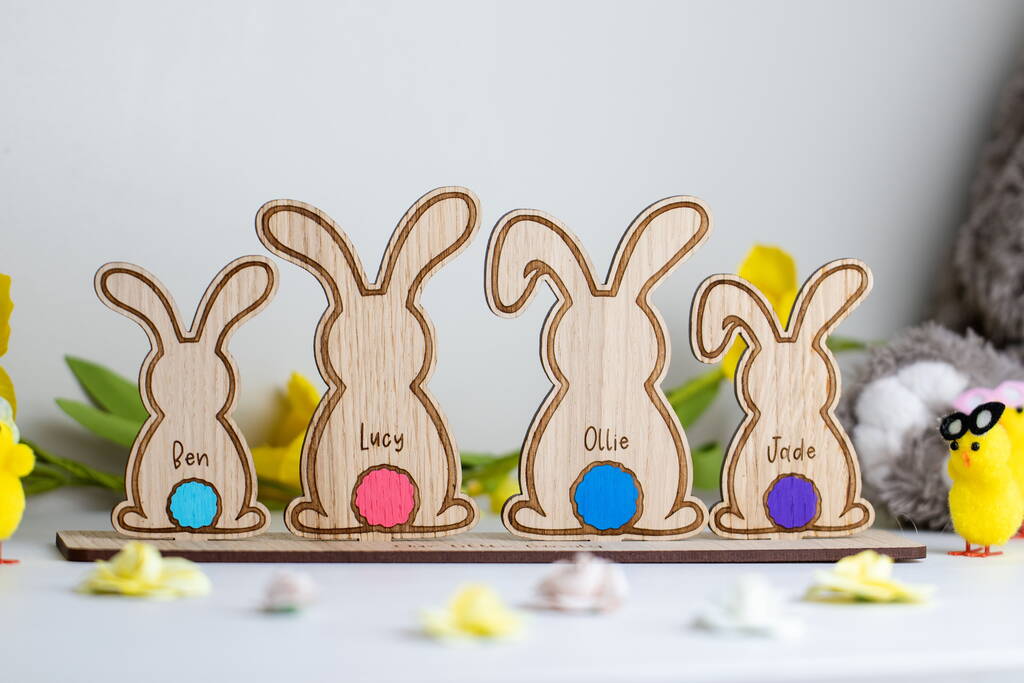 Crafted from high-quality 4mm oak veneer wood. Each plaque is laser engraved using industry-leading precision machinery to achieve crisp, clean detailing. Bunny tails are hand-finished in your chosen colours. Natural wood grain variations make every piece unique, adding to its character and charm. Designed and made in our UK workshop with careful attention to detail.