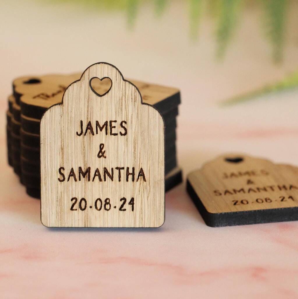 These wooden name place settings add a lovely finishing touch to your wedding tablescape. Each name is laser cut from real oak veneer and designed to sit neatly on or inside a dinner plate, creating a beautiful place setting for every guest. Choose from three design styles and order the quantity you need, from a small sample to larger guest lists. Perfect for rustic weddings, barn venues, woodland themes and natural floral styling. Add your list of names in the personalisation box (or message us if it’s a long list) and we’ll make them to order in the UK.