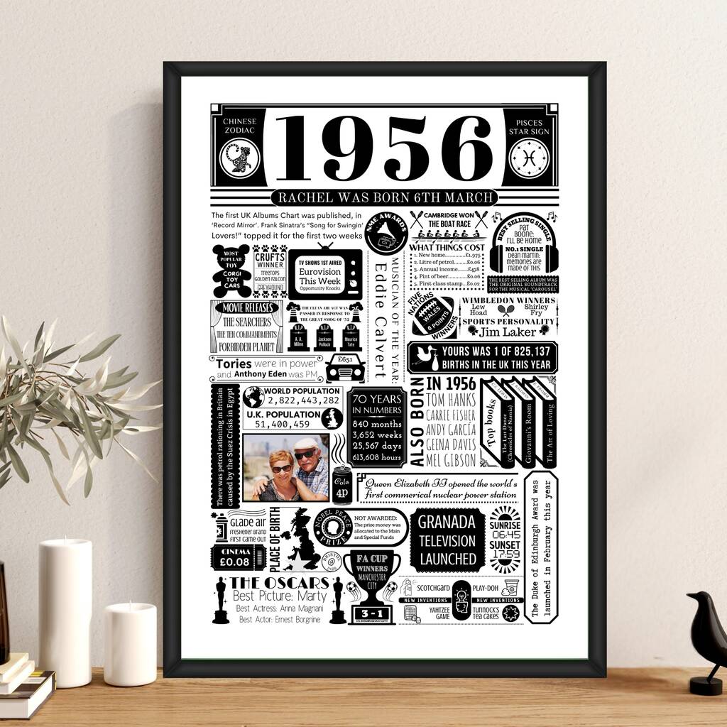 A unique and detailed personalised 70th birthday photo print packed full of facts from 1956.