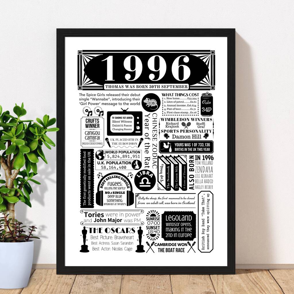 A special personalised 30th birthday print that is packed full of facts from 1996.
