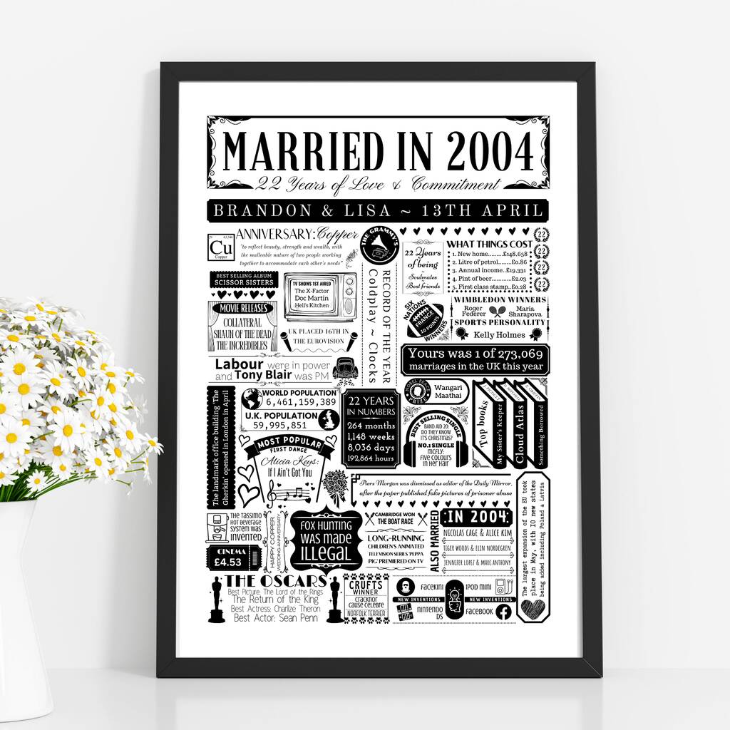 This is a great gift for your partner on your anniversary or friends and family who are celebrating their 22nd copper wedding anniversary. This print will take the recipient on a journey down memory lane and remind them of some of the key events and details from the year they got married.