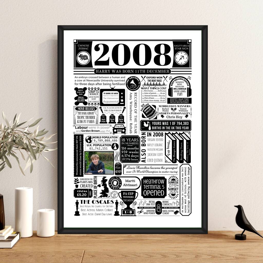 A unique and detailed personalised 18th birthday photo print packed full of facts from 2008.
