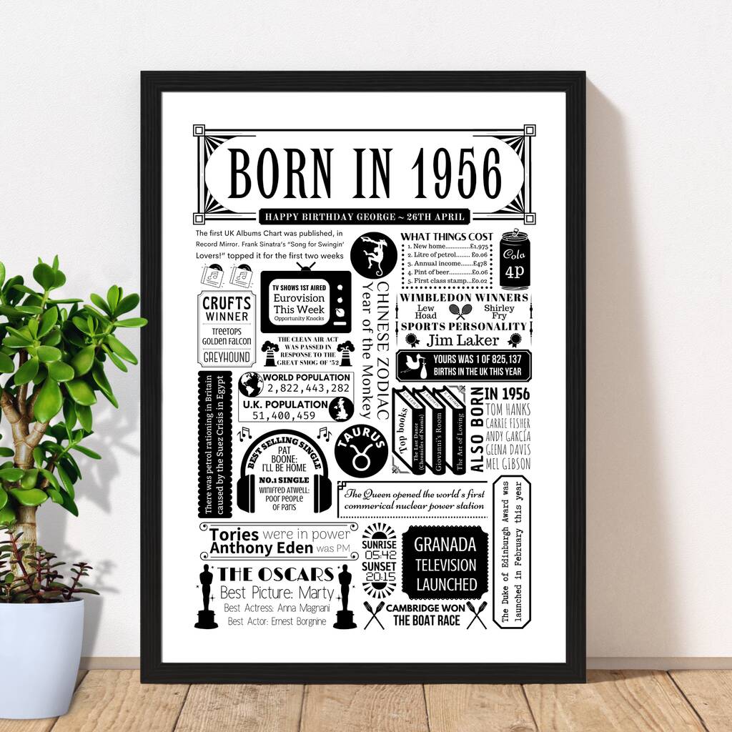 This personalised print provides fun facts from 1956 including horoscopes, film, music, books, TV, Sports and much more.