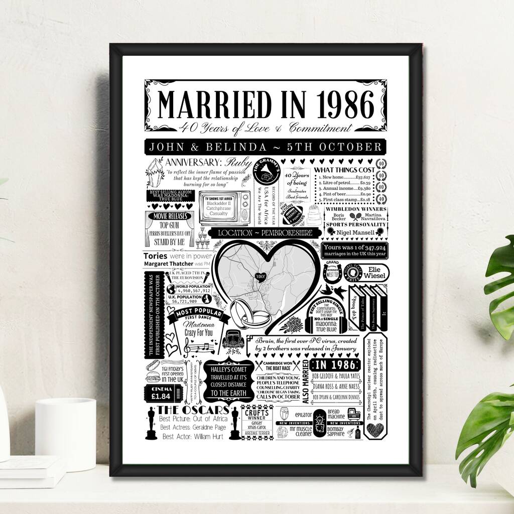 A personalised 1986 wedding map print celebrating your 40th ruby anniversary, featuring your wedding location alongside memorable facts from the year you married.