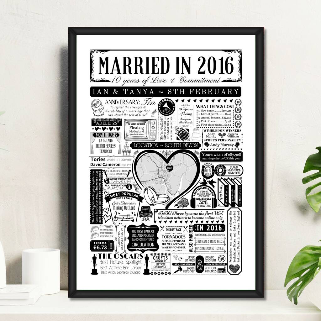 A personalised 2016 wedding map print celebrating your 10th tin anniversary, featuring your wedding location alongside memorable facts from the year you married.