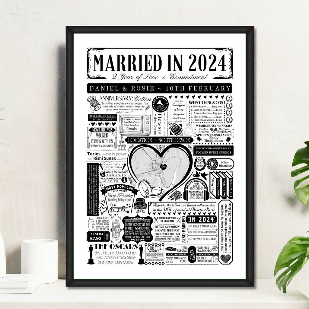 A personalised 2024 wedding map print celebrating your 2nd cotton anniversary, featuring your wedding location alongside memorable facts from the year you married.