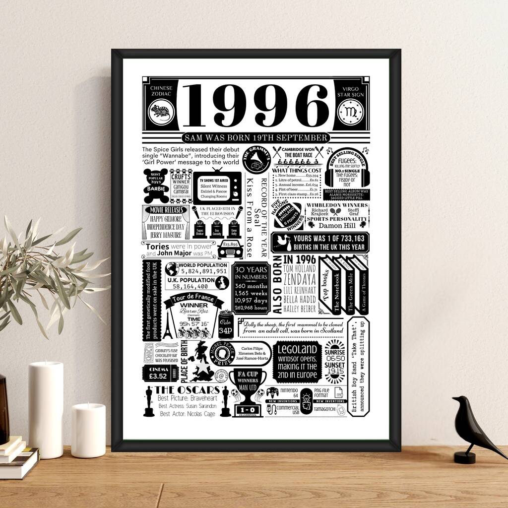 This personalised print provides fun facts from 1996 including star signs, film, music, books, TV, Sports, inventions and so much more.