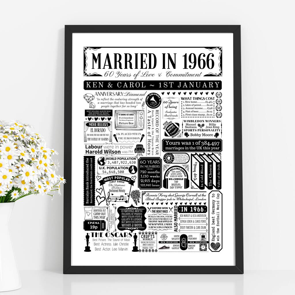 A thoughtful 60th diamond anniversary print that provides interesting facts from 1966.