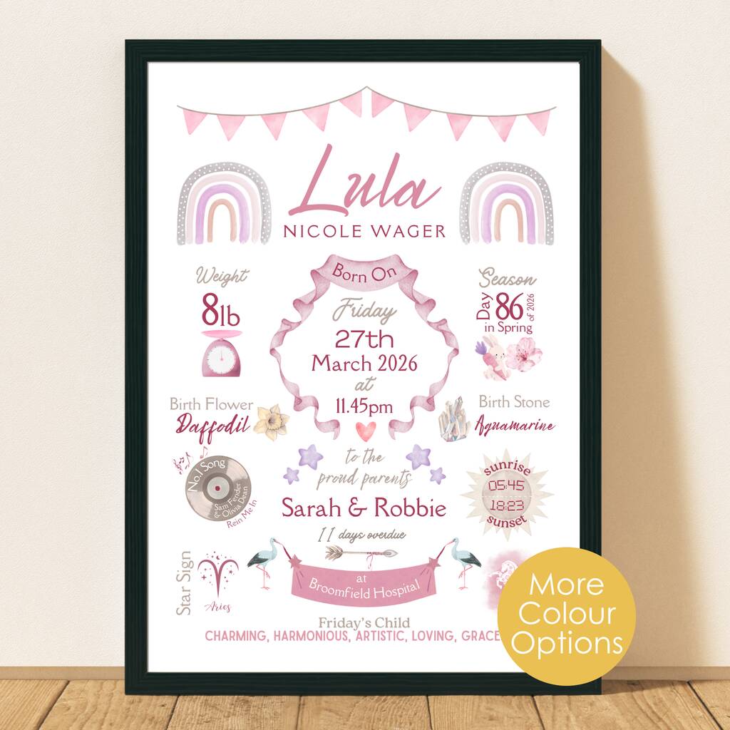 Personalised New Baby Print Birth Keepsake For Nursery Decor