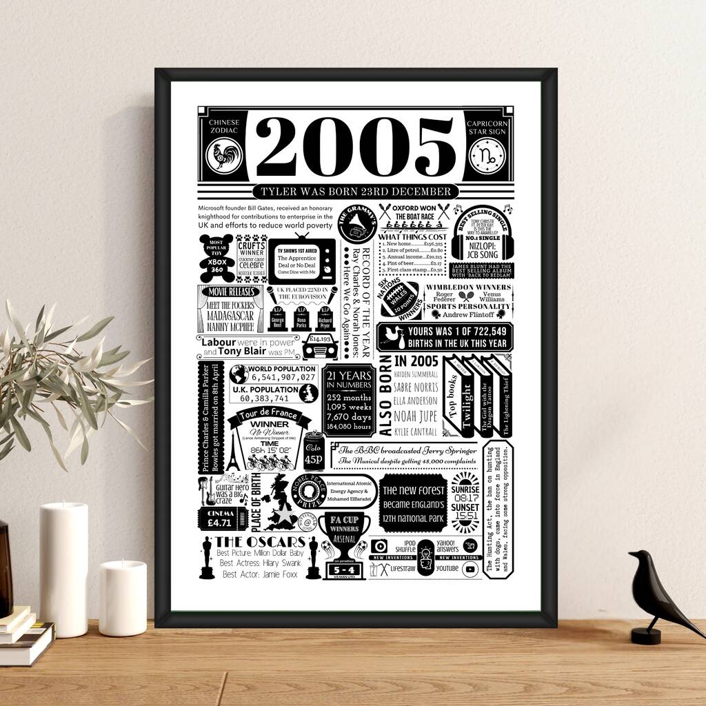 This personalised print provides fun facts from 2005 including films, music, books, TV, Sports, inventions and so much more.