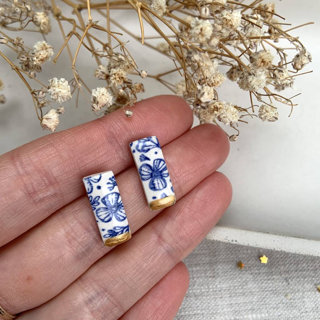 Blue And Gold Floral Ceramic Bar Stud Earrings, Minimalist Rectangular Studs