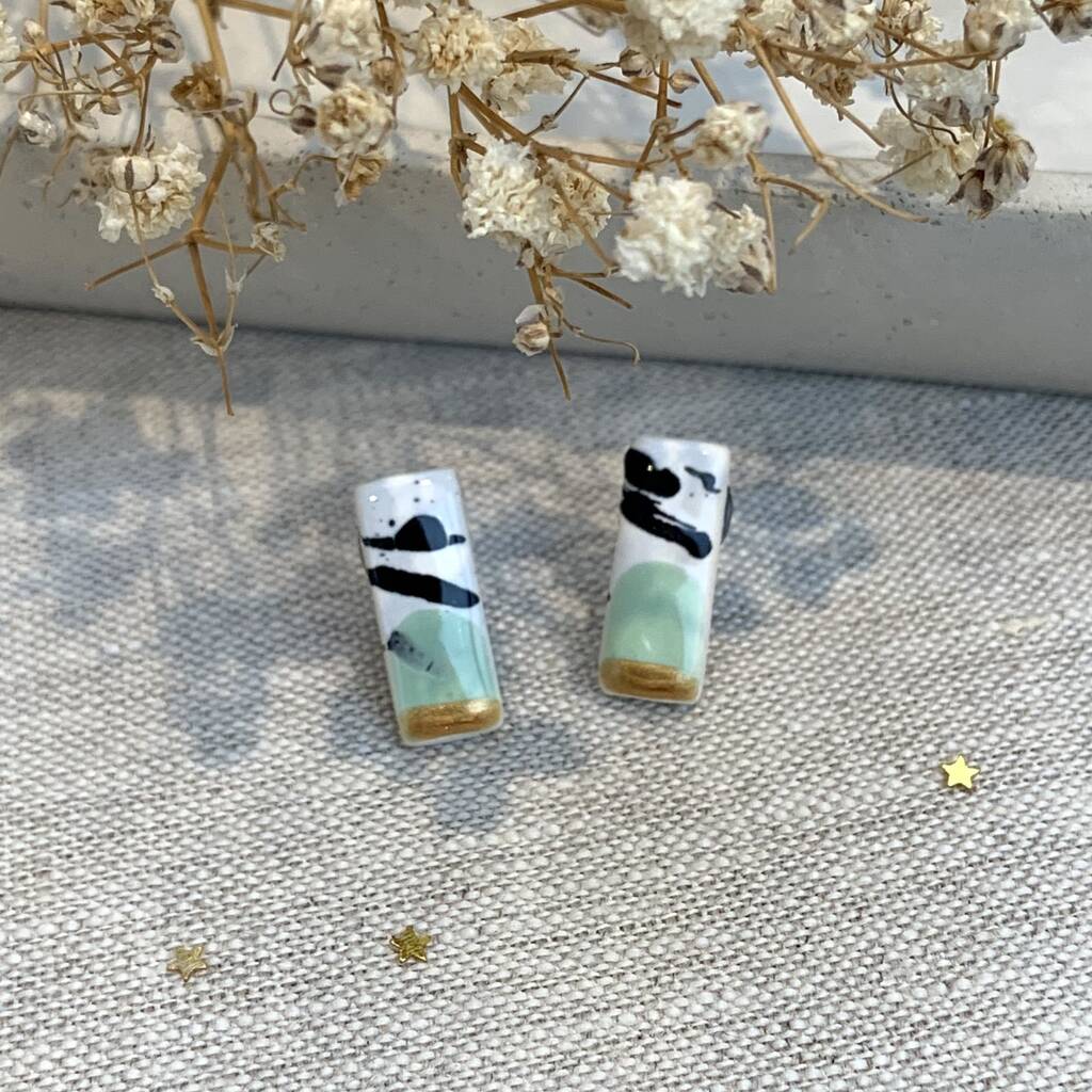 Mint Green And Gold Ceramic Bar Stud Earrings Abstract Splatter Minimalist Studs