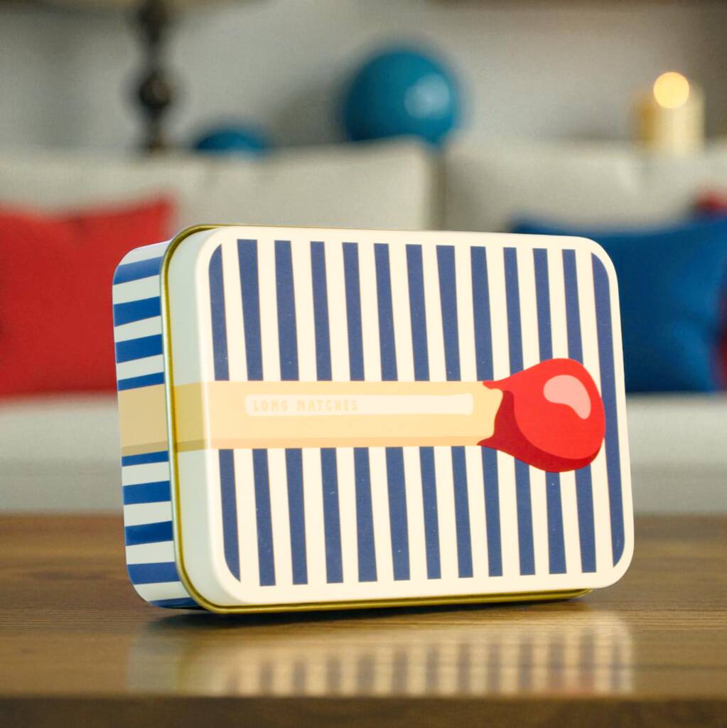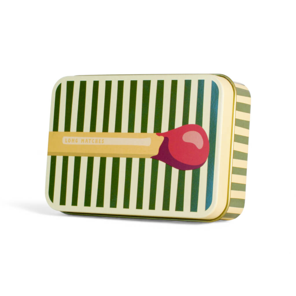 Designed to store 100mm (4 inch) matches. The 'Matchus Longus' tins bring a playful twist to match storage, with oversized matchstick artwork that extends off the lid, wraps down the sides, and continues under the base. Each compact 107 × 70 × 30 mm tin features a unique hand-drawn design, a hidden striker, and a luxurious gold interior to keep matches dry and ready. Perfect for lighting candles, stoves and fireplaces, and ideal as housewarming gifts, gifts for mums, gifts for dads, Secret Santa, or presents for people who have everything. Playful, practical and guaranteed to spark conversation.