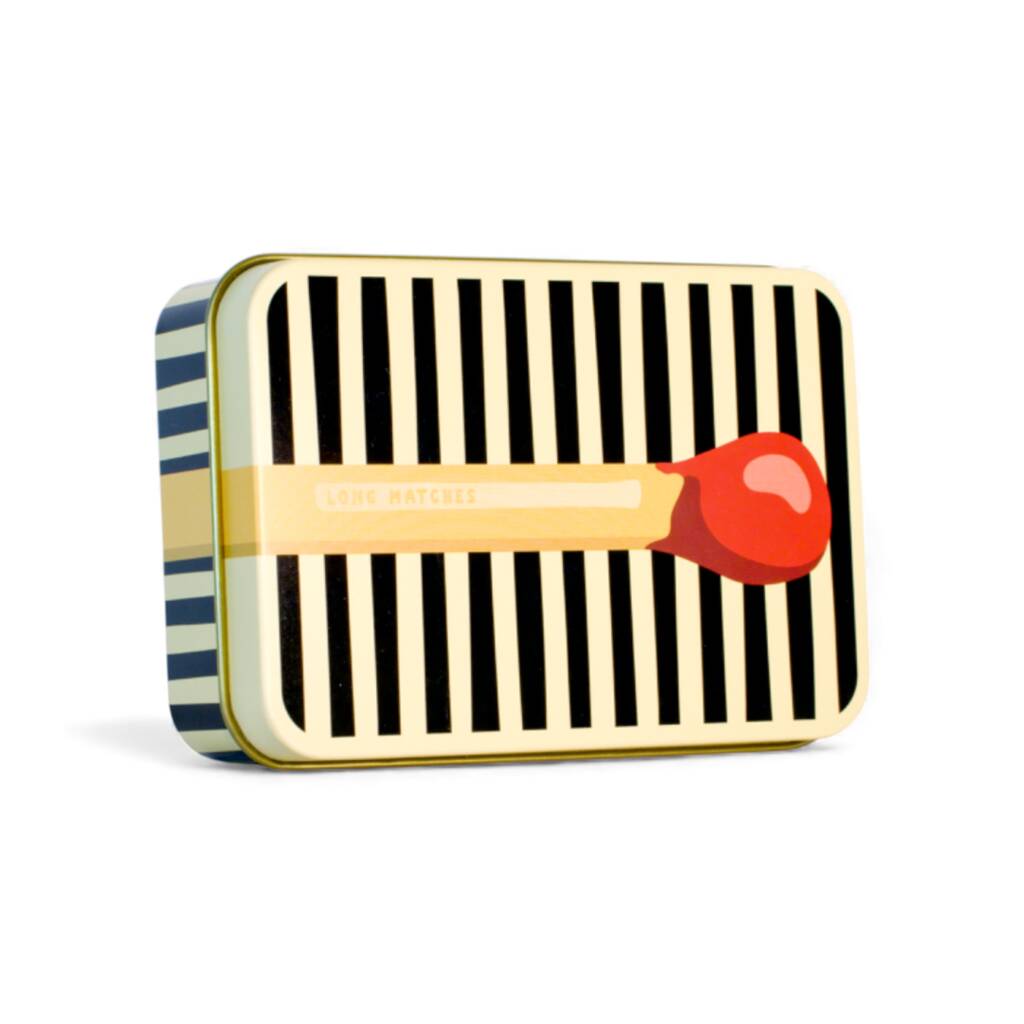 Designed to store 100mm (4 inch) matches. The 'Matchus Longus' tins bring a playful twist to match storage, with oversized matchstick artwork that extends off the lid, wraps down the sides, and continues under the base. Each compact 107 × 70 × 30 mm tin features a unique hand-drawn design, a hidden striker, and a luxurious gold interior to keep matches dry and ready. Perfect for lighting candles, stoves and fireplaces, and ideal as housewarming gifts, gifts for mums, gifts for dads, Secret Santa, or presents for people who have everything. Playful, practical and guaranteed to spark conversation.