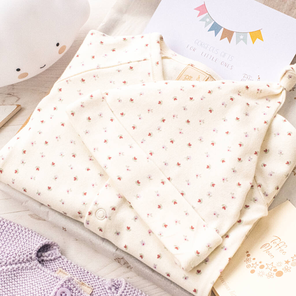 A sweet baby girl gift set: soft cotton jersey babygrow with matching knotted hat in a delicate blossom-and-heart print. Perfect for new arrivals.