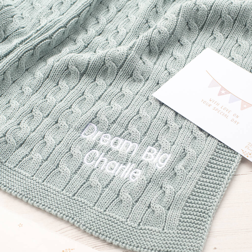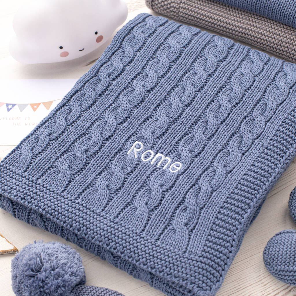 A practical new baby boy blanket knitted from soft cotton suitable from birth with option to personalise with embroidered name and date-of-birth for cherished keepsake.