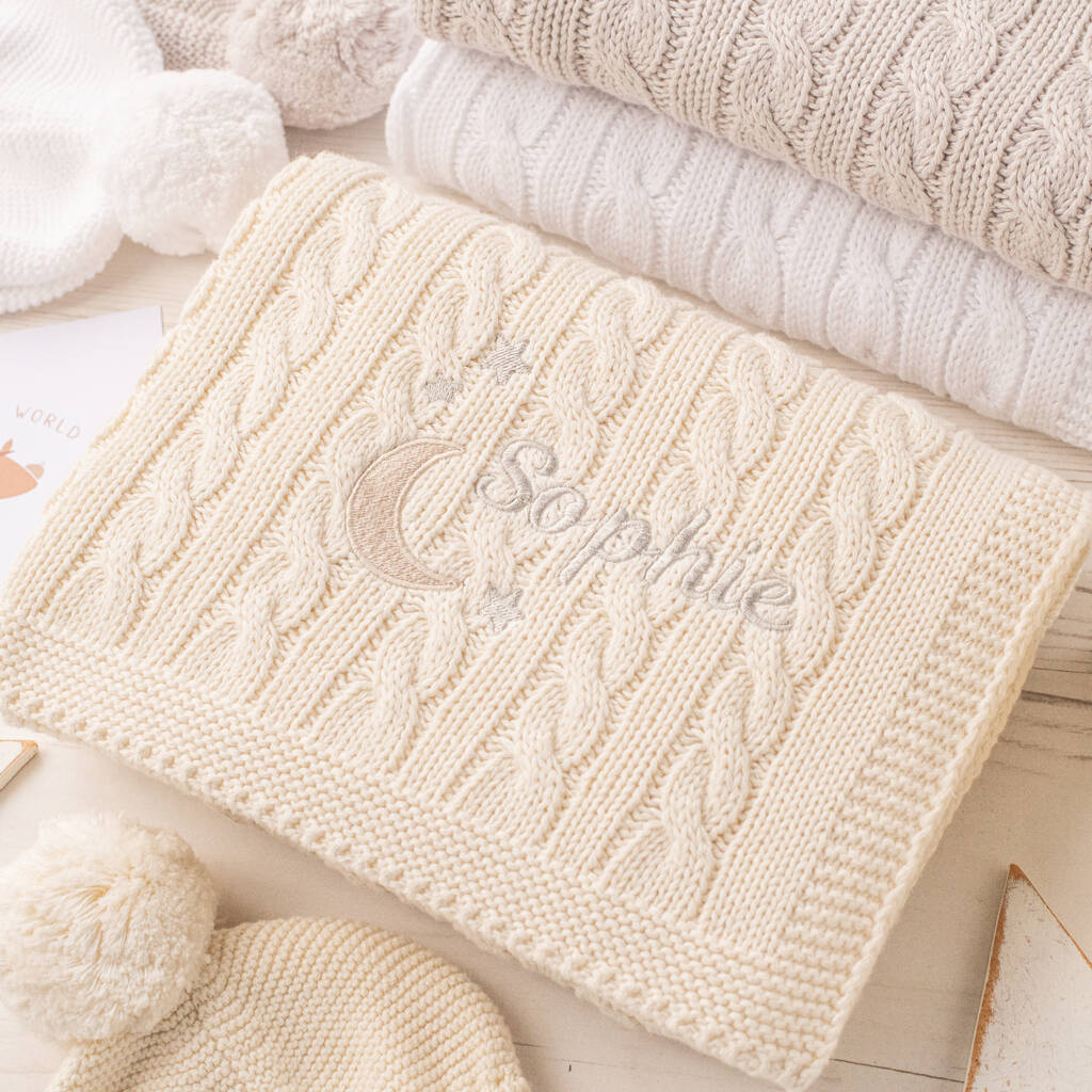 A soft cream baby blanket personalised with baby’s name and a moon and stars embroidery. A timeless gift for newborns, baby showers or Christenings.