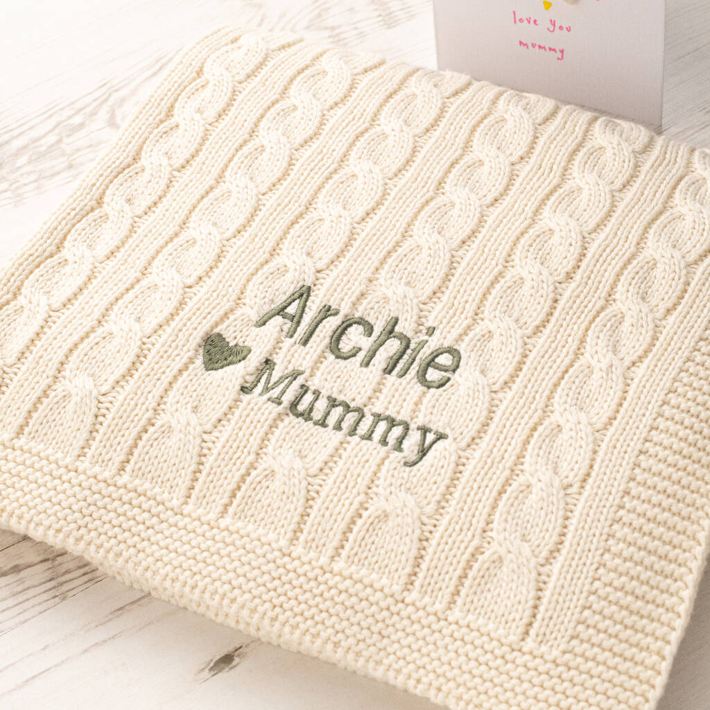 Celebrate a precious new arrival with this beautifully soft personalised luxury baby blanket, designed to be treasured for years to come. Expertly knitted in a timeless cable pattern, each blanket is embroidered to order with your chosen name and message, creating a truly meaningful keepsake. A special Mother’s Day embroidery option is also available, making it an unforgettable gift from baby to mummy while remaining a classic new baby essential.