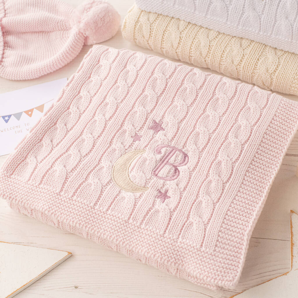 A soft pale-pink baby blanket personalised with baby’s initial and a moon and stars embroidery. A timeless gift for newborns, baby showers or Christenings.