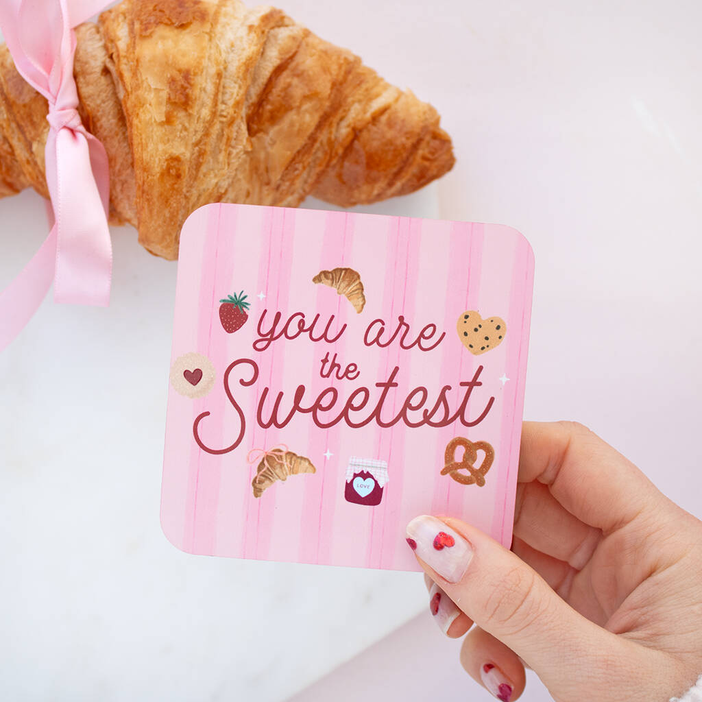 A fun “You Are The Sweetest” coaster featuring cute pastry and breakfast icons.