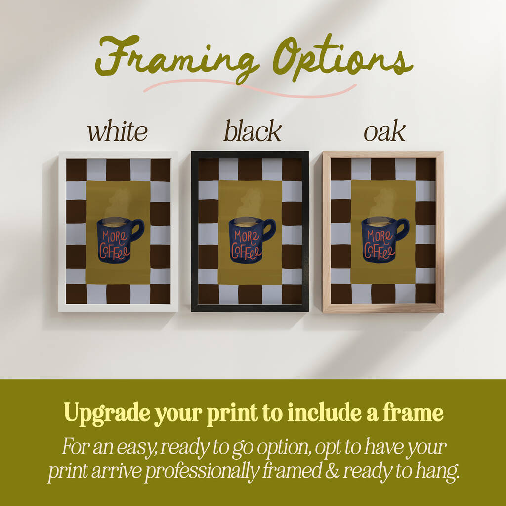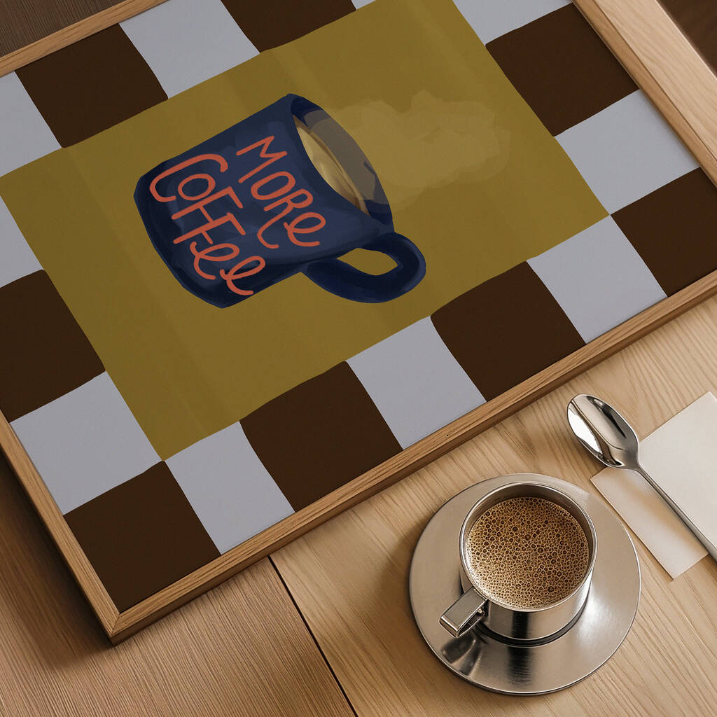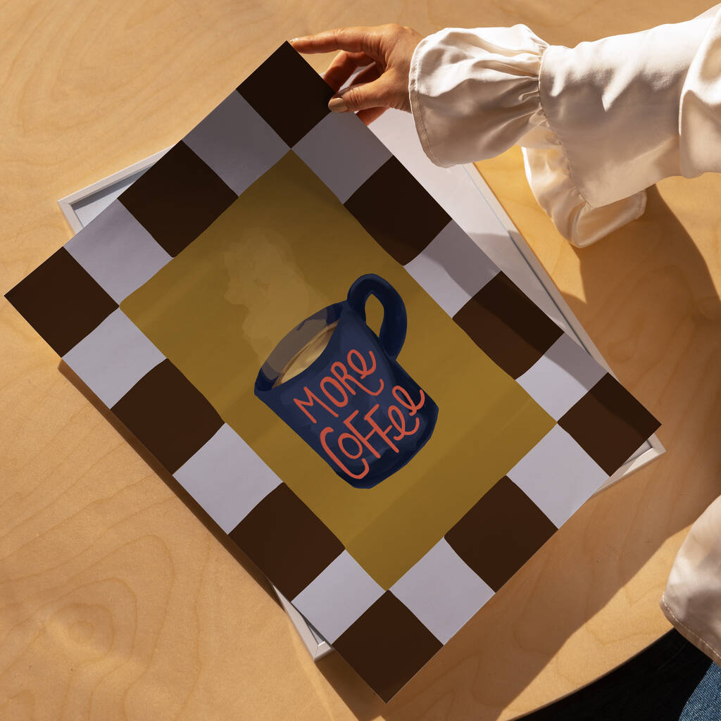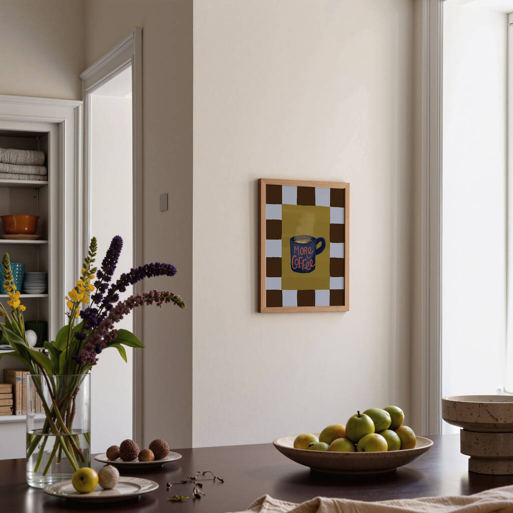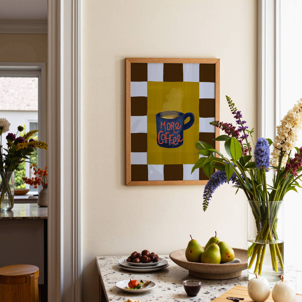 This hand-illustrated coffee print is a love letter to caffeine; featuring a steaming navy mug, hand-lettered with the words More Coffee, surrounded by a bold checkered border in warm mustard, mocha brown and soft blue tones. It’s the perfect piece of kitchen wall art for coffee lovers, adding a touch of modern art print charm to your morning routine or breakfast nook.