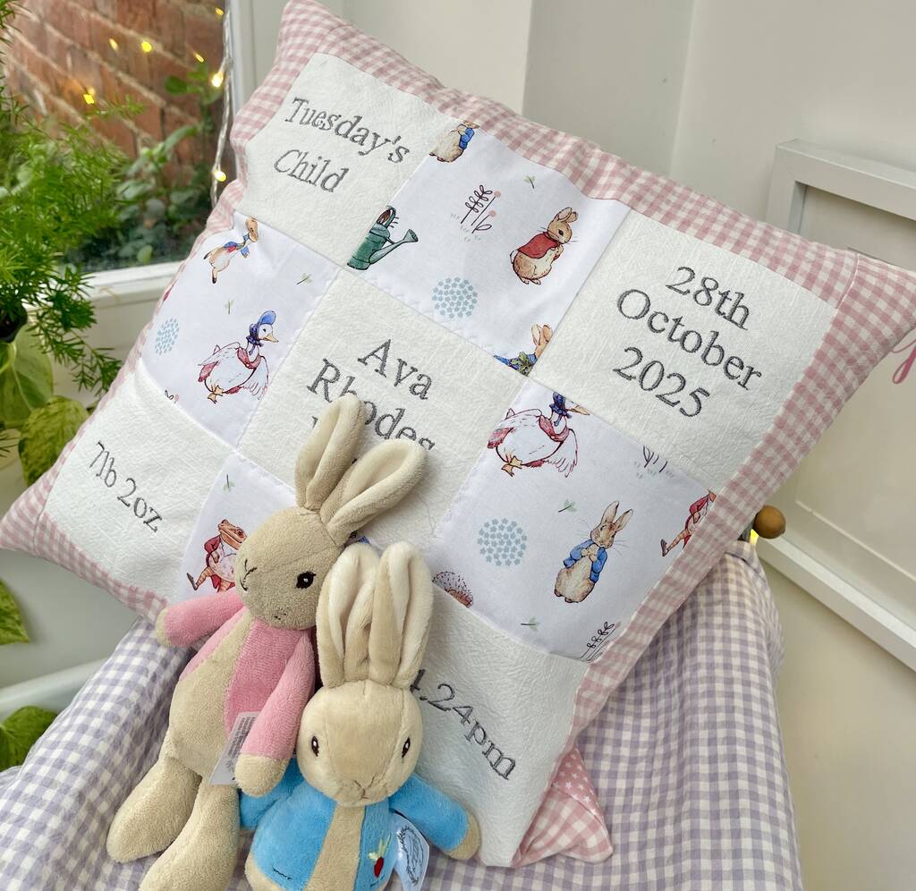 This gorgeous memory cushion** is created using a beautiful, classic Peter Rabbit print fabric. Alongside patches of linen, you can personalise this cushion with your child’s birth details.We will embroider your child’s name, birth date, weight, time and day they were born. Then the cushion is finished with a traditional gingham border. Choose from pink, blue, red, natural or duck egg blueThe perfect gift for a new baby, christening, baptism, naming day or even a birthday!A truly wonderful keepsake for a child to grow up with. For something extra for your child to love, add a cute Peter Rabbit or Flopsy Bunny toy!We will tie the little toy character to the cushion with a satin ribbon - so it’s truly special.