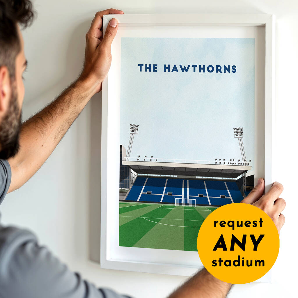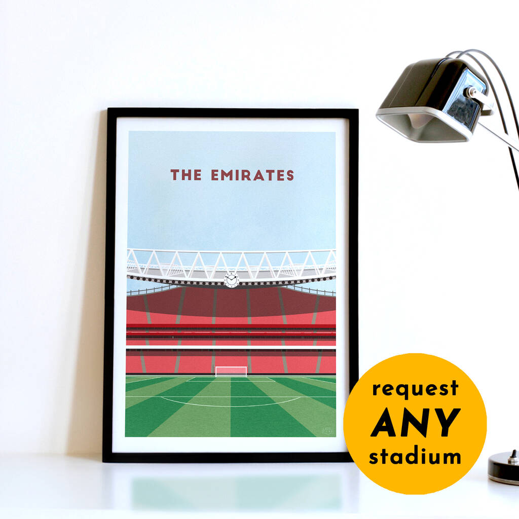 A personalised football print gift, featuring a contemporary illustration of your favourite team's home stadium. Available as an unframed or framed print.