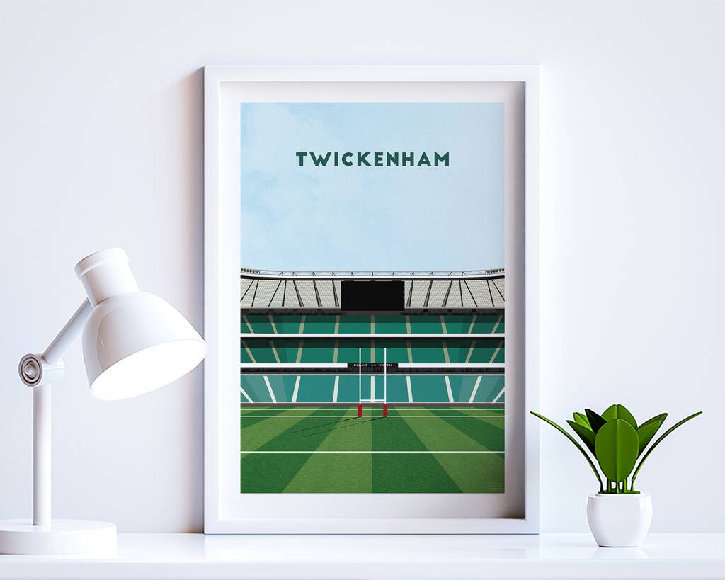 An England Rugby poster gift, featuring a contemporary illustration of Twickenham stadium in London. Available as an unframed or framed print.