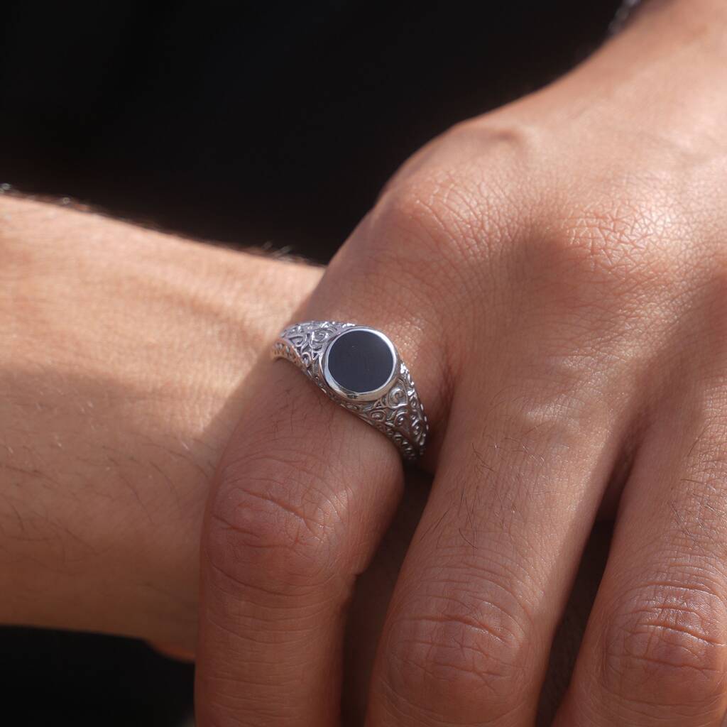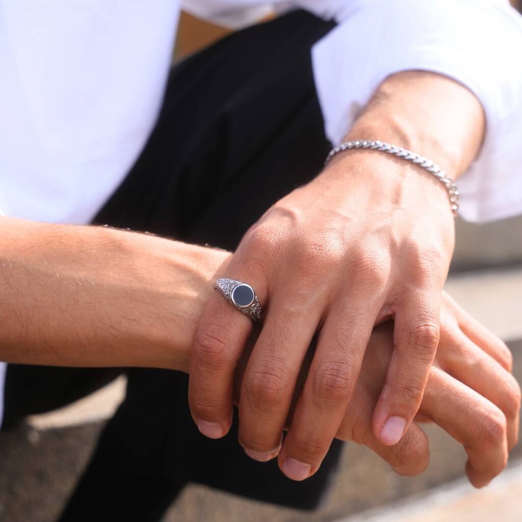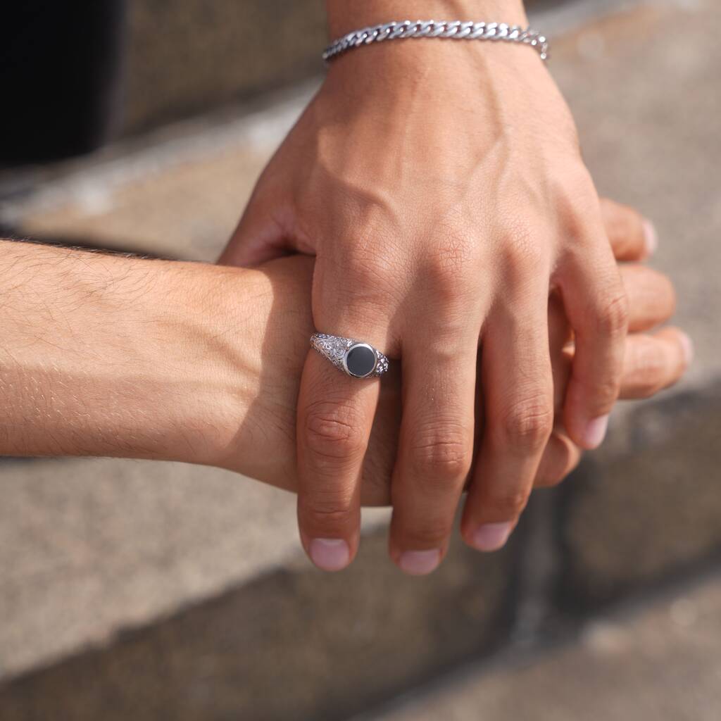 The Signet Noir - A deep black enamel centre is framed by vintage-patterned detailing, creating a balance of bold contrast and intricate design.