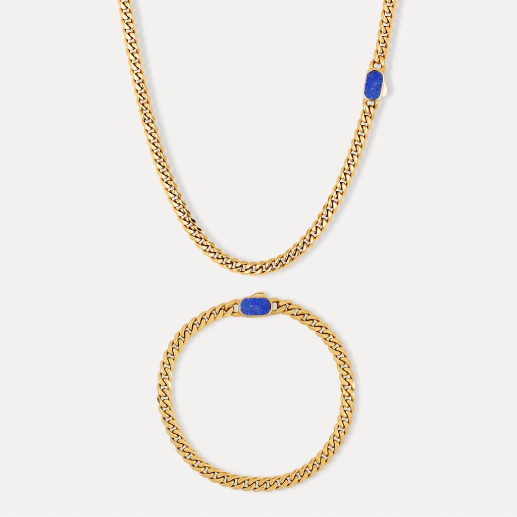 Lapis Cuban Chain Necklace and Bracelet set! The 5mm cuban link with an Lapis Lazuli gemstone on the closure.