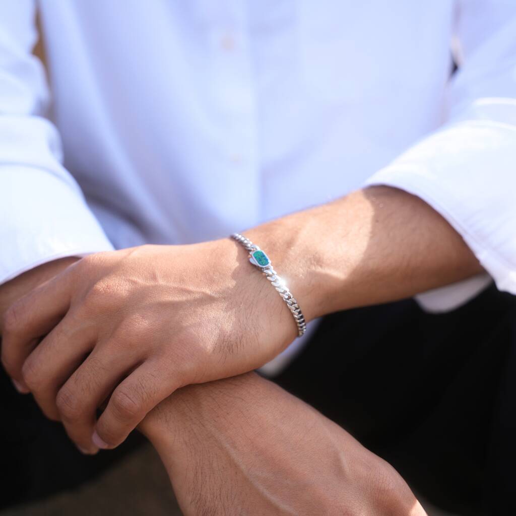 Our classic Silver 5mm Cuban bracelet with a Green Opal gemstone on the clasp. A middle ground between thick and thin - noticeable but not intrusive, this chain is perfect for wearing day to day.