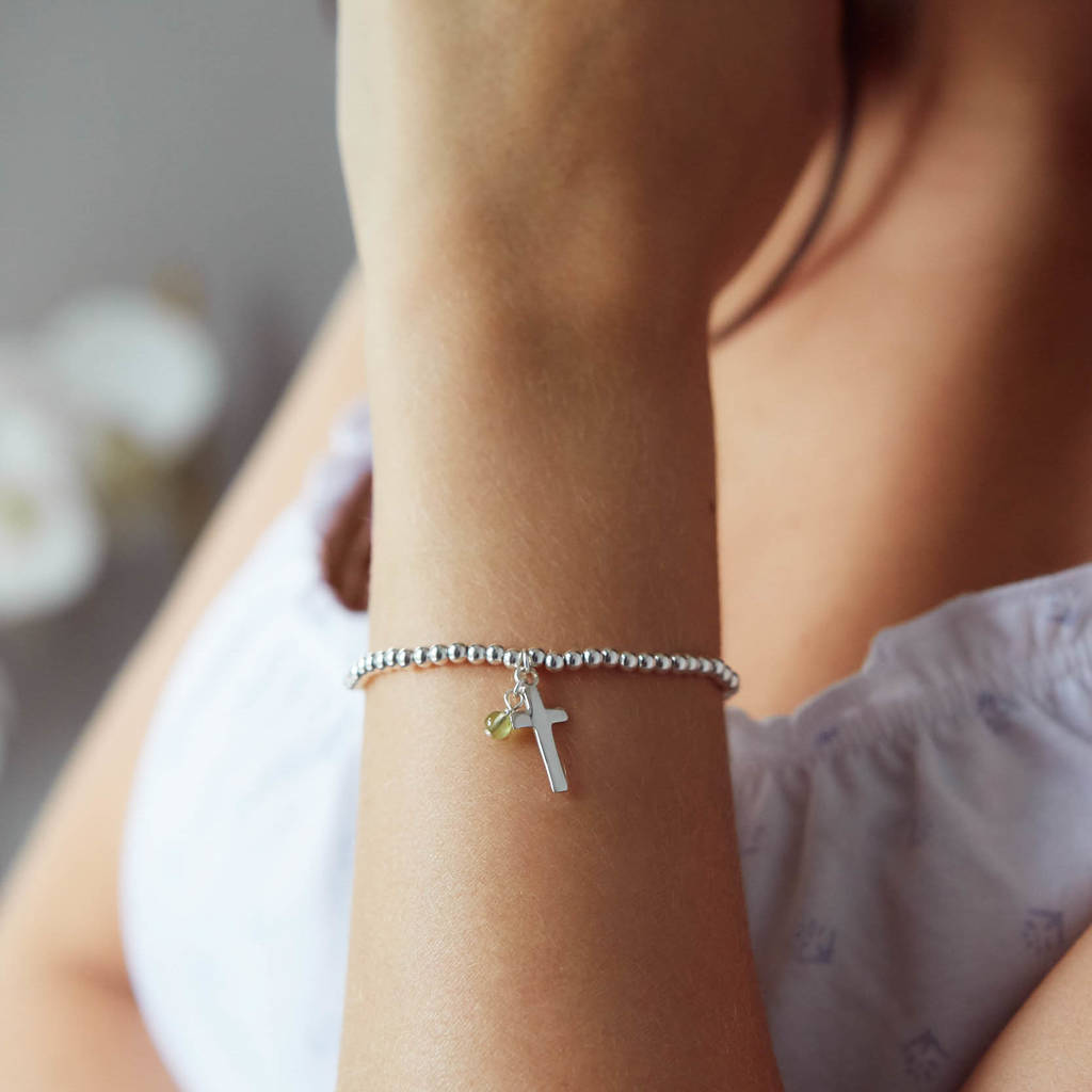 Handmade in sterling silver, it features a row of handcrafted silver beads, a cross-shaped charm, and it can be personalised with the optional birthstone charm of your choice.
